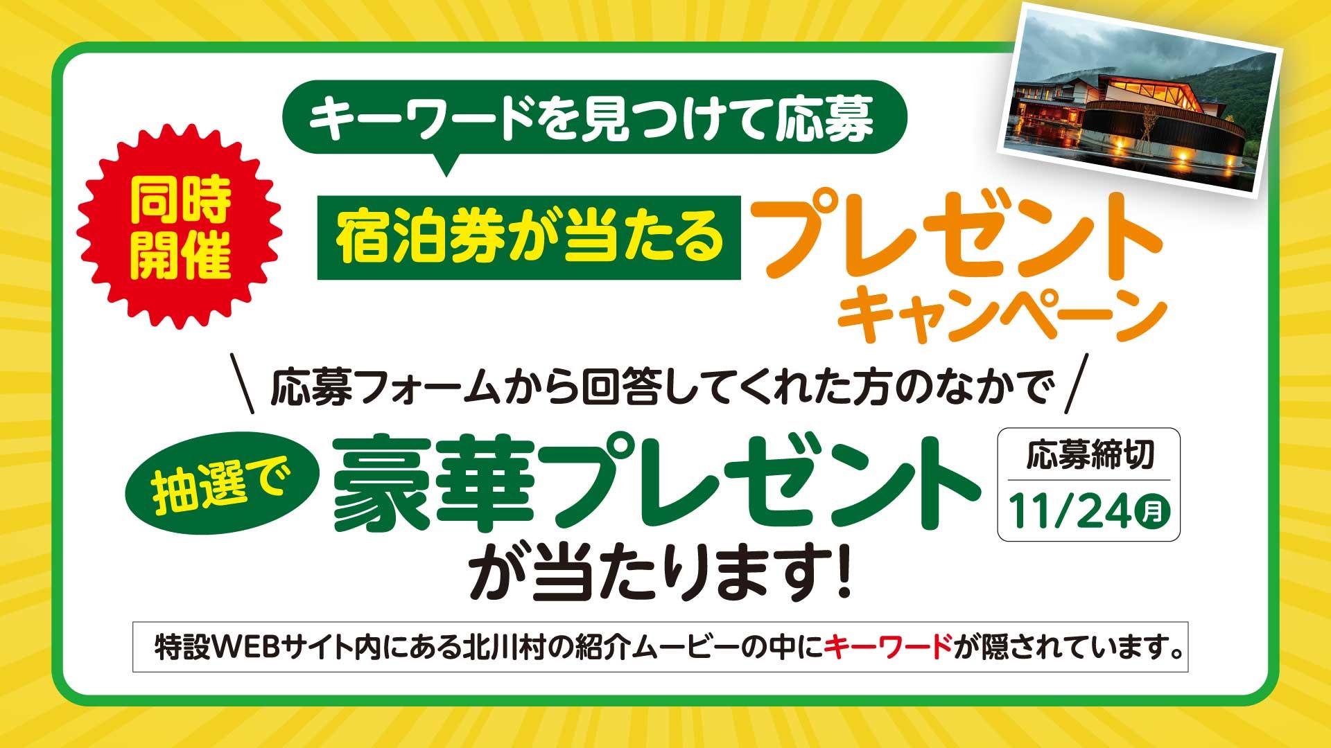 応募方法 | 本ウェブサイト内にある動画をご覧いただき、専用フォームからご応募ください。 ※キーワードは動画の中にございます。 ※応募の際に「特別賞」「まるごと北川村賞」「ウテナSDGs賞」「よどや(ウェルシア)賞」の いずれかをお選びください。 ※応募はおひとり様一回限りとさせて頂きます。 |