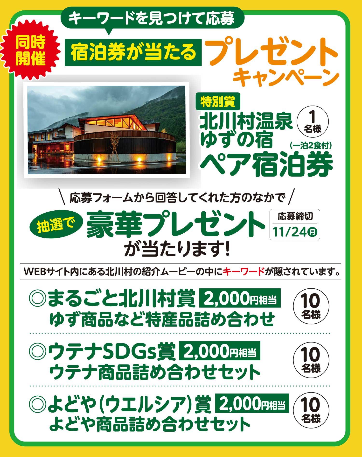 商品 | 【特別賞】 当選者数:1名様 ・北川村温泉ゆずの宿 ペア宿泊券(1泊二食付) 当選者数:1名様 【まるごと北川村賞】 当選者数:10名様 ゆず商品など特産品詰め合わせ(2,000円相当) 【ウテナSDGs賞】 当選者数:10名様 ウテナ商品詰め合わせセット(2,000円相当) 【よどや(ウエルシア)賞】 当選者数:10名様 よどや商品詰め合わせセット(2,000円相当) |